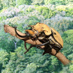Native to Central and South America, this beetle is one of the largest in the world. Its body and horn can be as long as 6.75 inches, and they can weigh up to four ounces. They feed on dead plant matter and fruit found in the rainforest. The male has 2 black horns that are as large as its body while the female does not. These beetles are also very strong; they are able to carry as much as 100 times their own weight! They are nocturnal beetles but very much attracted to light. Mating takes place during the rainy season. If a male feels threatened by another male when he is trying to find a mate he will pick him up with his horns and throw him to the ground, usually defeating his competition. The larva grows for about 9 months in decaying wood before pupating in a case made of wood fiber. Black and gold adults will roam around looking for rotting fruit to eat. |